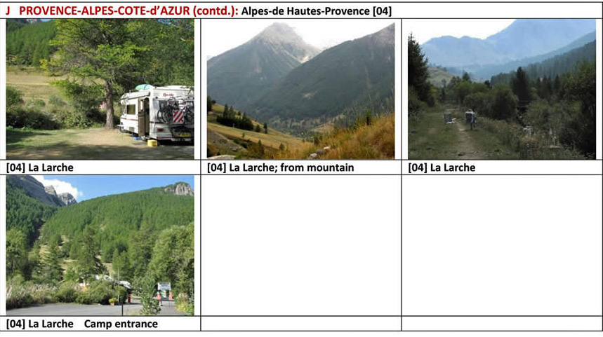 PROVENCE-ALPES-COTES-D'AZUR La Larche. Our favourite mountain campsite. set amongst larches on the banks of fast river. Fieldfares, lesser whitethroated warblers. Excellent restaurant in site, run by the owners, and also in nearby village. Magnificent long walks. |