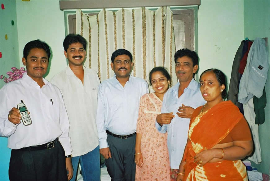 | The most special; Surya's family. Surya on left with first cell phone; Suresh Kumar (who was my first friend, met on the cricket pitch); Swarna's husband; Swarna; Venkateshwara Rao (father), and mother | |