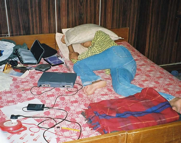 | Imran hiding from the world; typical electric muddle spread over bed in guesthouse | |