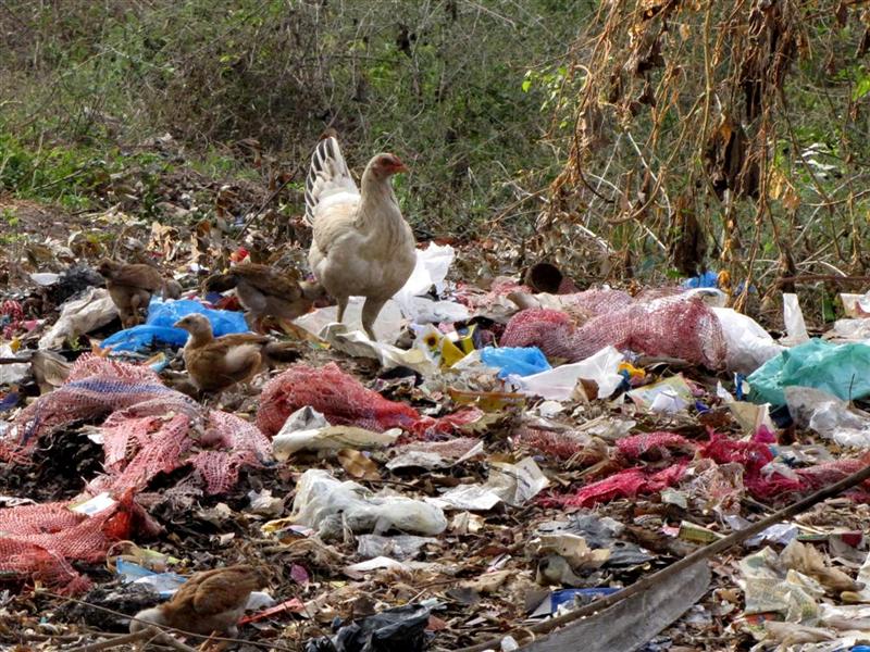 | The chickens make use of the roadside rubbish |
