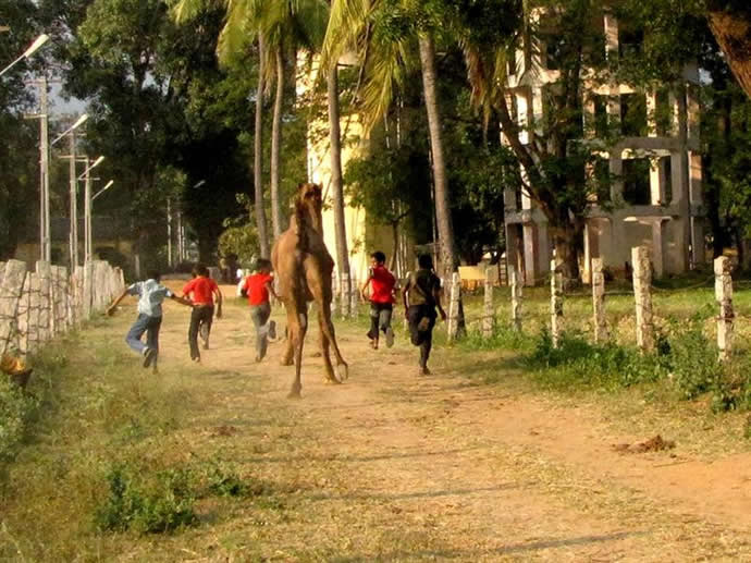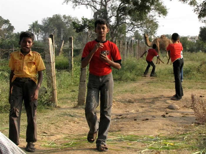 | Boys irritating the dairy farm camels |