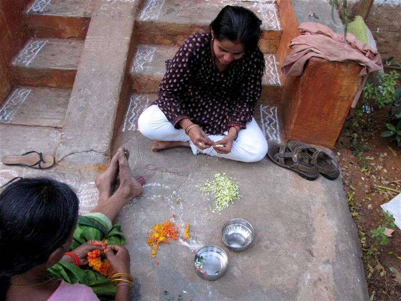 | Lokesh's aunts making marigold and jasmine hair decorations while i drink my coffee |