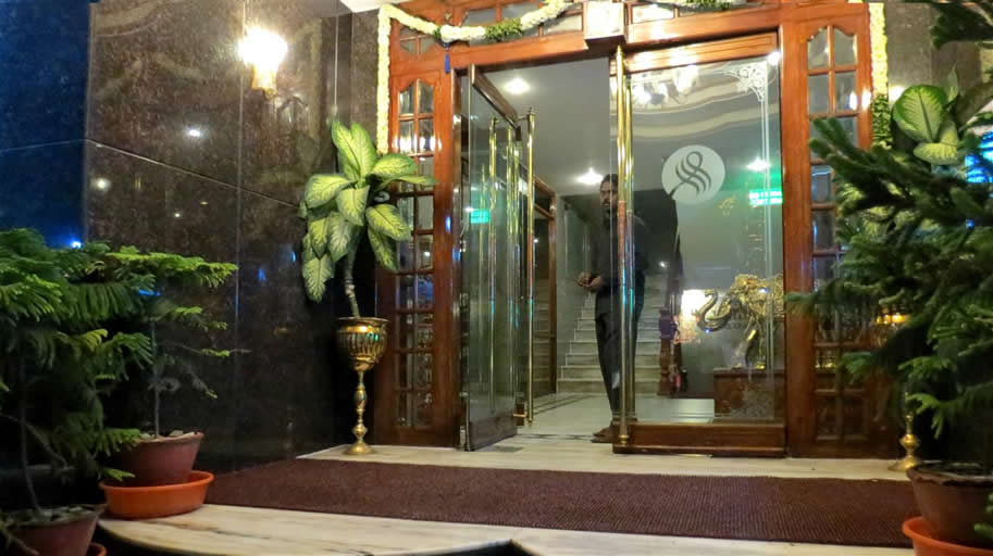 | Entrance to Sindhuri Park Hotel where I ate most evenings. This cool entrance is directly opposite the temple tank | |