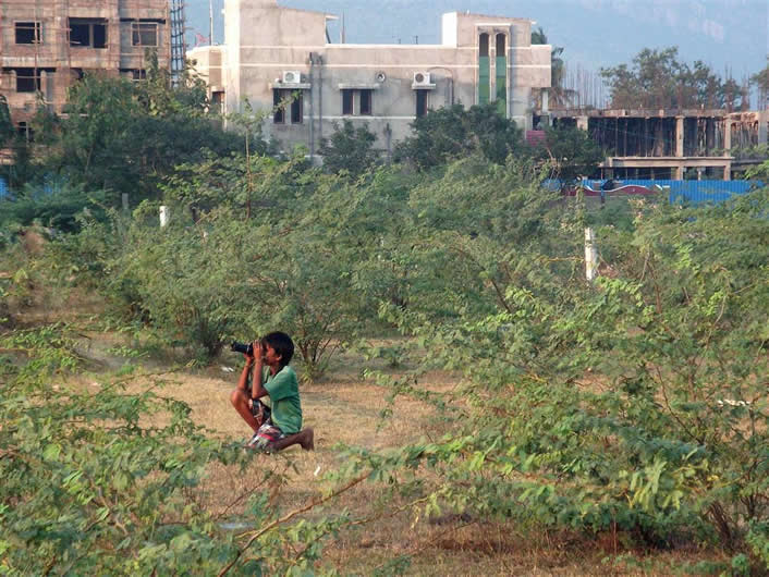 | Balu photographing birds in the rough ground towards Thumulagunta with some of the big houses being built there | |||||