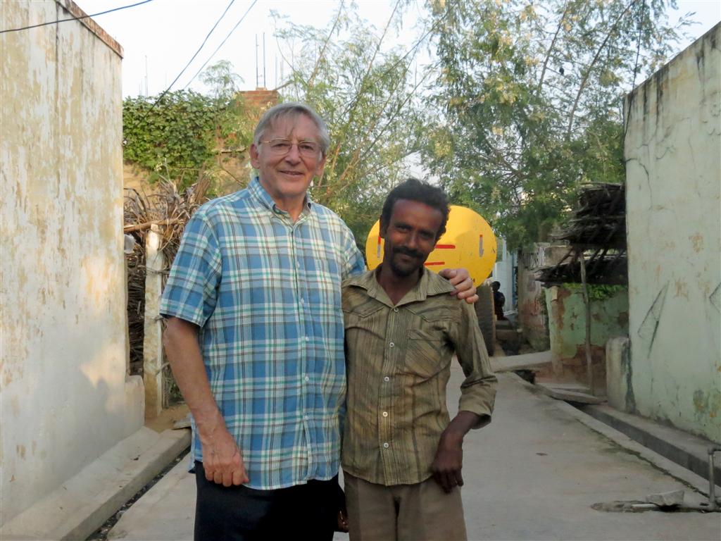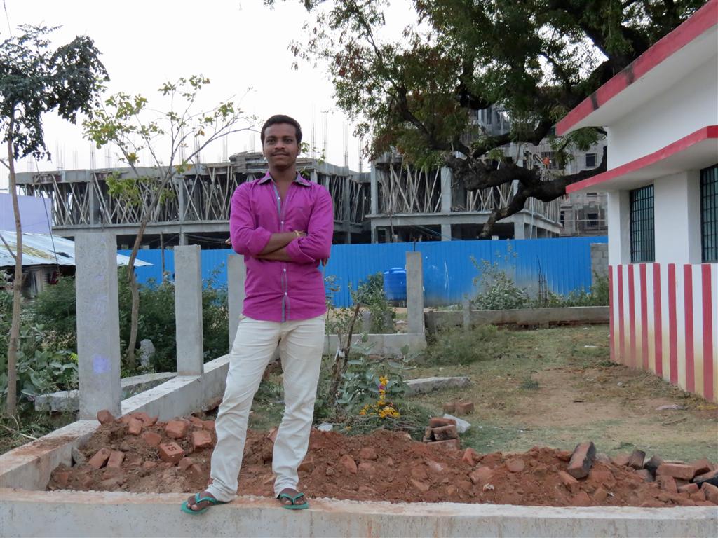 | Venkataramana (one of my 1st young friends in Mallepalle; now a heavy family man). Outside the small temple that is on way into the village. In the background is a block of flats, one of many threatening the rural nature of the village. | |||||