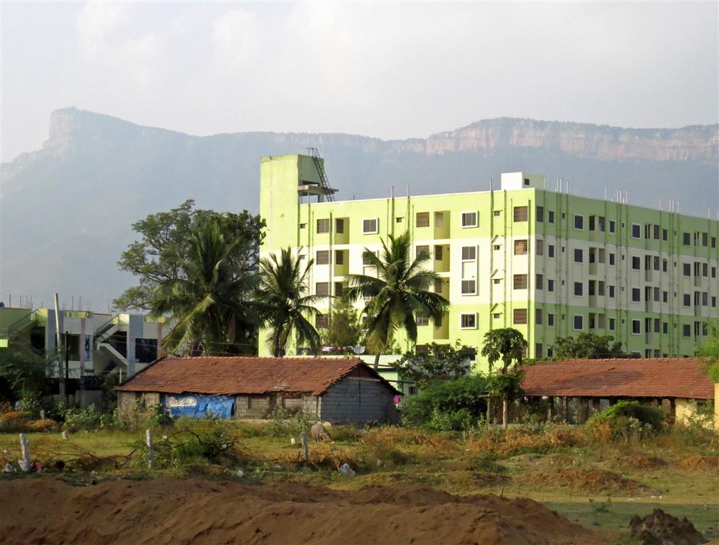 | View from path from west end of the village looking towards the hills, showing more blocks of flats and in the foreground what used to be the chicken sheds on the little track towards the main part of Thummalagunta | |||||