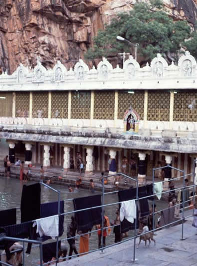 | Kapilatheertham (waterfall) temple. The waterfall cascades into the tank which is used for ritual bathing before darshan in the sanctuary, and also as the local swimming pool by the boys. Top of Page | |