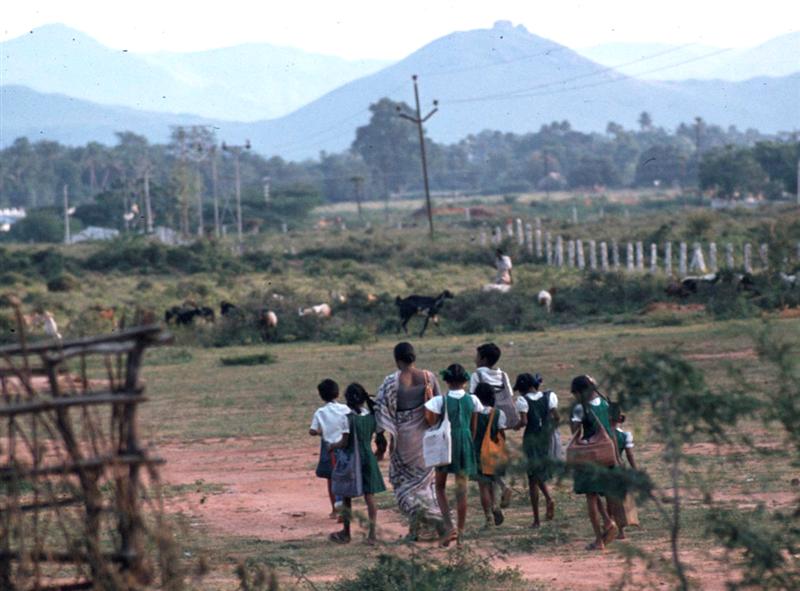 | School children on way home. The shaven boys gave their hair to Sri Venkateshwara at Tirumula temple. | |