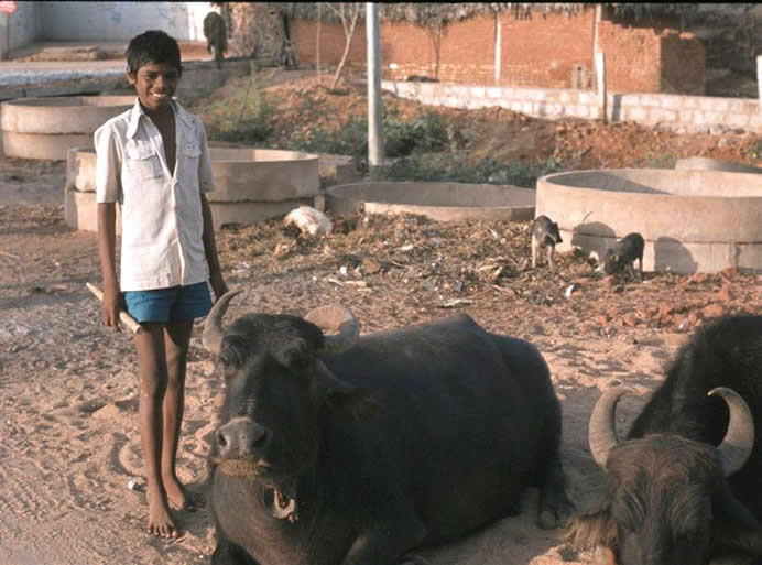 | My friend who first took me to the village showing his family buffalo | |