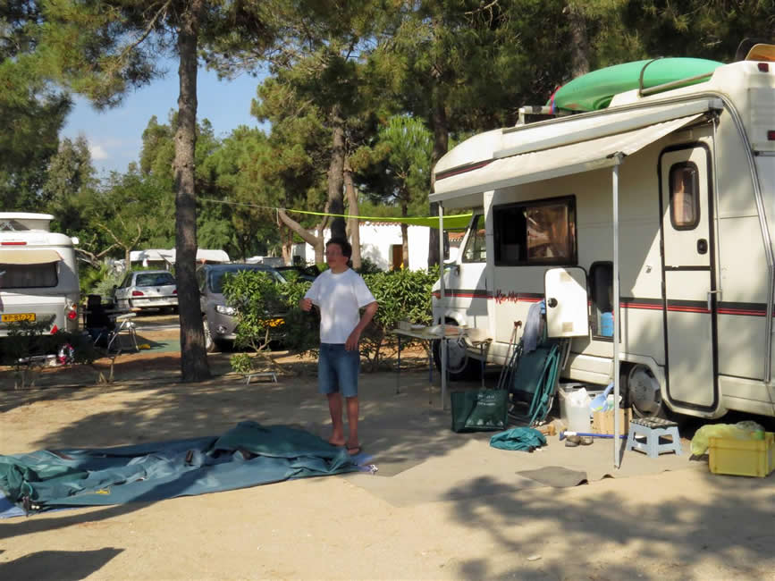 | Our campsite beneath the pines, surrounded by high peaks of the Pyrennees. | |
