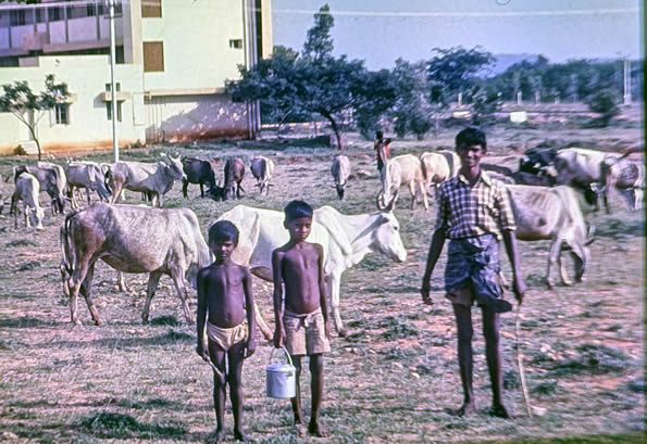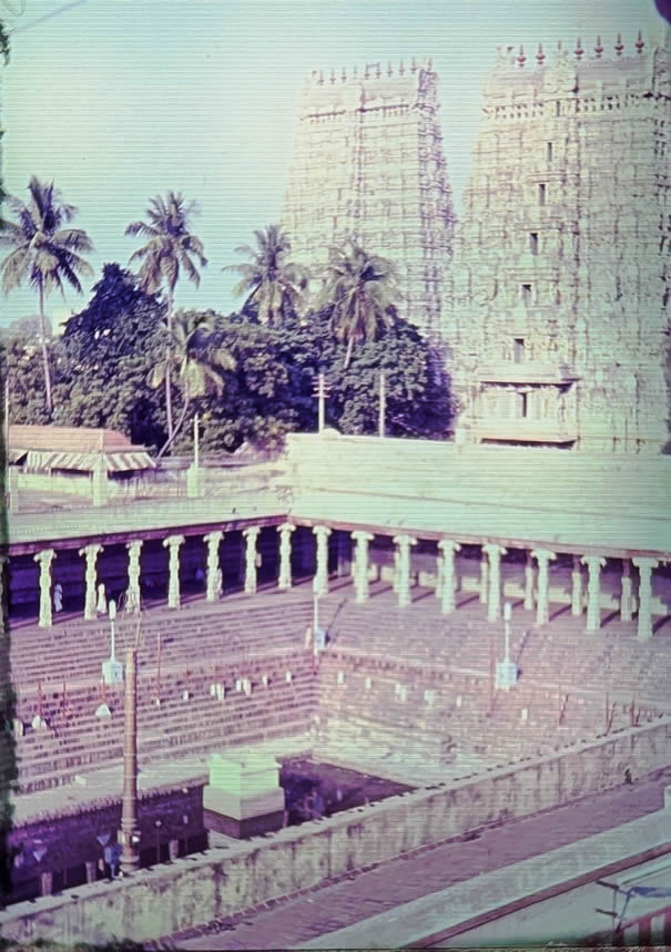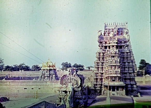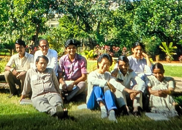 Madurai 1985 I was the main lecturer on the 4 week course on biological membranes sponsored by UNESCO in the School of Biological Sciences at Madurai Kamaraj University, organised by the head of the School C. Rajamanickam. The 4th week was The II International Symposium on Biomembranes: Structure, Biogenesis and Transport, organised by Rajamanickam. There were 12 students on the course, one from Iran and the others from South Asia. The University is in a rural area about 14 Km from the centre of Madurai with its a world famous Meenakshi temple. Madurai is in Tamil Nadu, South India. I flew to Madras, thence to Madurai. After the conference I went by bus to Kerala to a beach resort (near Kovalam), then by train to Cochin, flying home from there by way of Madras. These pictures are from very old Agfa slides which become overcome by magenta which i have tried to correct. |