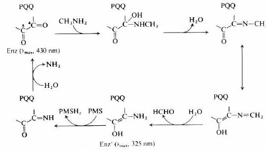 | ..................... | The reaction catalysed by methylamine dehydrogenase (MNDH) A is the artificial electron acceptor phenazine methosulphate. In the cell it is amicyanin (see below). |