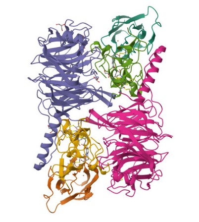 Many of the methylotrophs that gow on methanl are also able to grow on methylamine. The methylamine dehydrogenase (MNDH) responsible for the first step in its oxidation was first described by Peter Large (with Rod Quayle) in Methylobacterium extorquens in 1961. The assay system was almost the same as that which we had described for the methanol dhydrogenase (MDH) in the same organism. Its novel prosthetic group was later shown to be an orthoquinone called Tryptophan Tryptophylquinone (TTP). So methylamine dehydrogenase is, like MDH, a quinoprotein. |