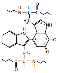 | The prosthetic group of MNDH - Tryptophan Tryptophyl Quinone (TTQ) During the oxidation of methylamine the 6,7 orthoquinone is reduced to an orthoquinol. The hydrogens are then transferred to phenazine methosulphate in the enzyme assay system. In whole cells the acceptor is amicyanin which accepts the electrons, the hydrogens being released as protons. ![]() |