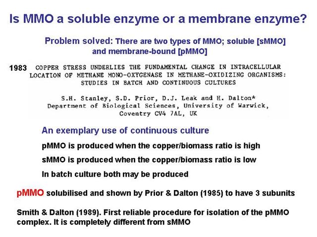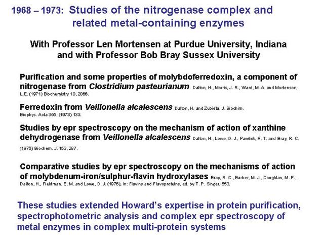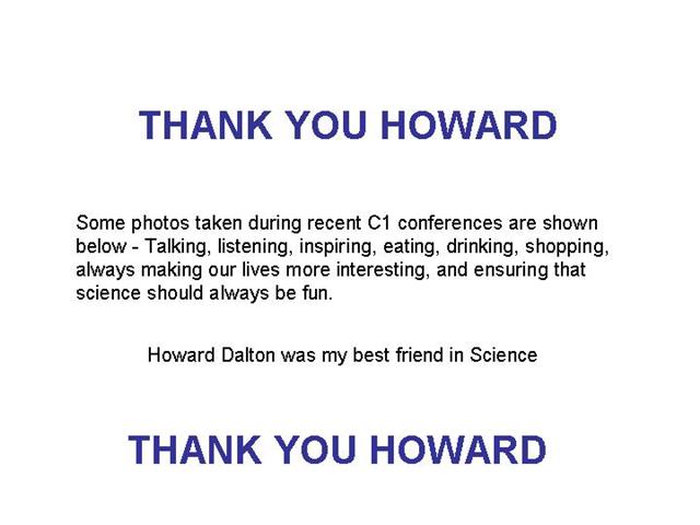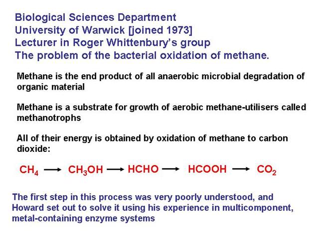These are the slides I used in the Celebration of the Life of Howard Dalton at the University of Warwick on 19th May 2008. This has now been published in an expanded form: C. Anthony (2008). A tribute to Howard Dalton and methane monooxygenase. Science Progress 91, 401 - 403. [Click for pdf]