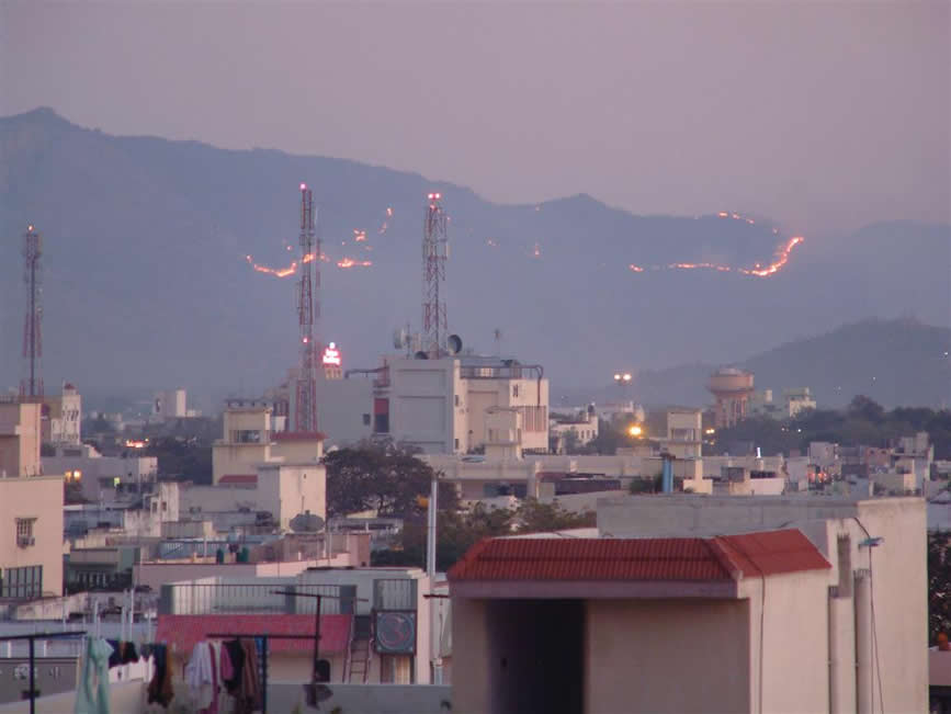 | The forest burning; from Sai Gopal's roof during violet sunset. Photoshop tried to remove it | |