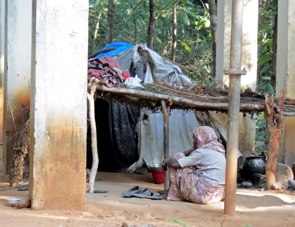 | Three very old people live in this tiny shelter under the water tank | |||