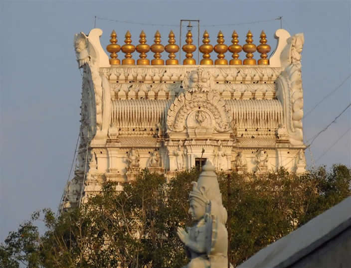 | Top of the small gopuram of Sri Govindaswamy temple in the town centre; in the setting sun | |||