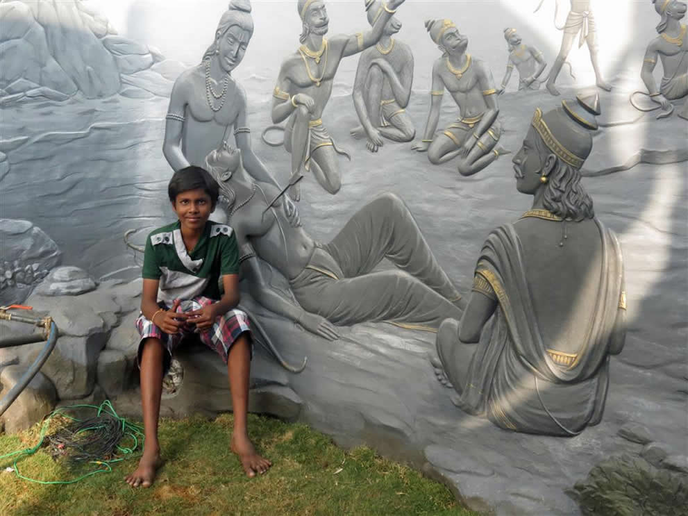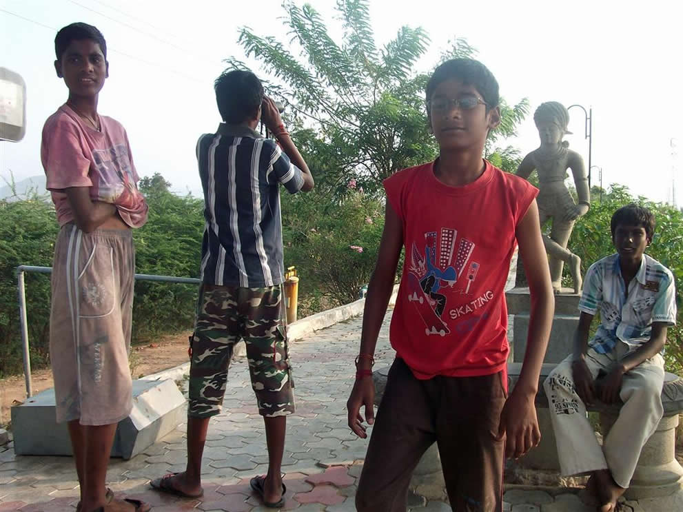 | Thumulagunta Park 2014 This is a large area, part of which is labelled a lake on the map. It is between the main part of Thumulagunta and the bypass to the South. At this time of year it is dry and used for cricket etc. It is surrounded on the North and East by a raised walk-way decorated with sculptures and beautiful Bourgainvilleas. At the Thumulagunta end is a huge 'statue' of Hanuman with depictions of his exploits and a place to view the park and to meditate at the top. This was a favourite place for the gang to suggest for us to go and so these pictures are taken from a number of visits. The park is a great place to go in the evening with its setting sun and cool(ish) breeze. Return to main Thumulagunta page Return to India pictures 2014 Other India pics |
