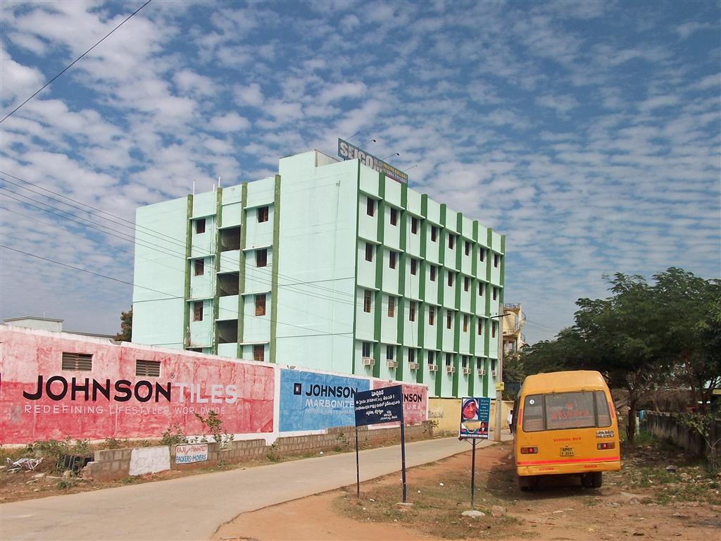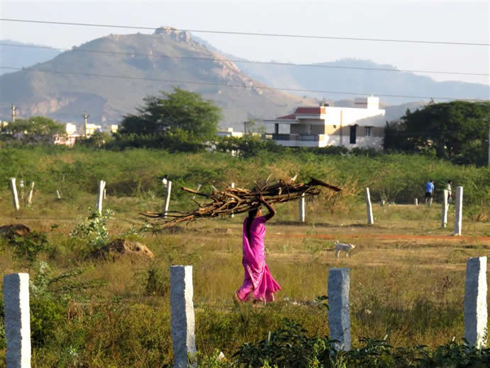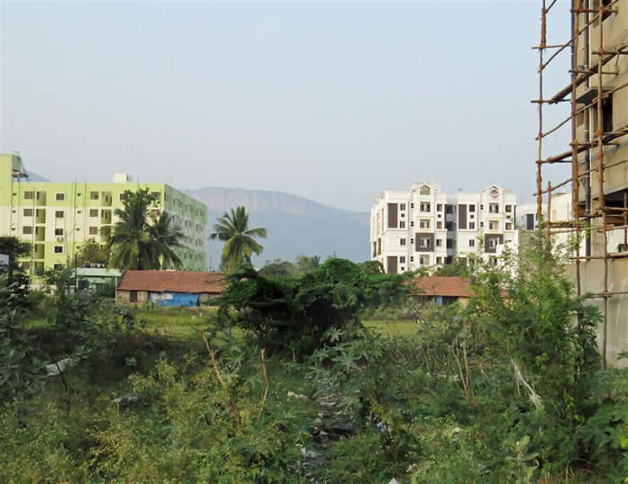 | View from path from west end of the village looking towards the hills, showing more blocks of flats and in the foreground what used to be the chicken sheds on the little track towards the main part of Thummalagunta | |||||