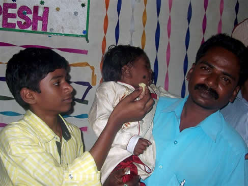 | Mounish with baby friend Bobby force-feeding baby on its 1st birthday |