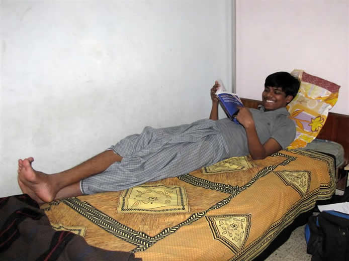 | Moin in guest house in his favourite relaxed mode, reading a biochemistry textbook |