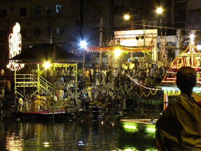 | The Temple tank opposite Sindhuri Park hotel. The god from the temple is taken on a very noisy floating ride around the tank every night during one week in February |