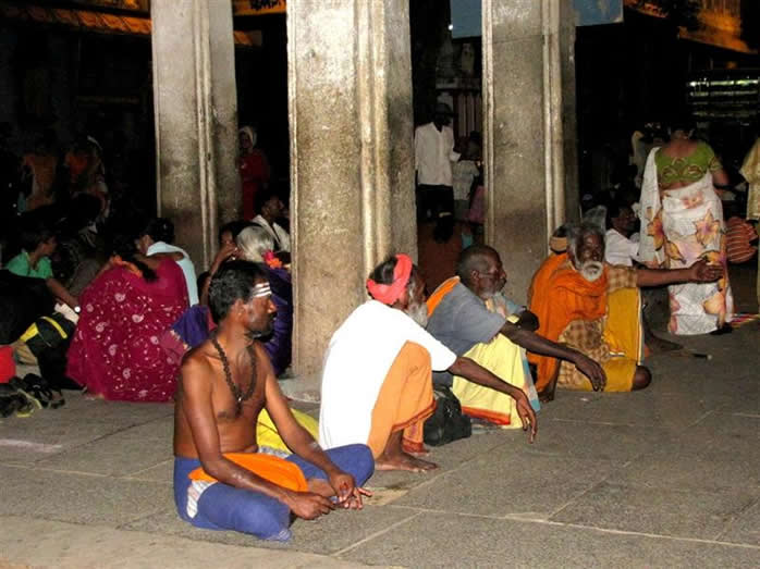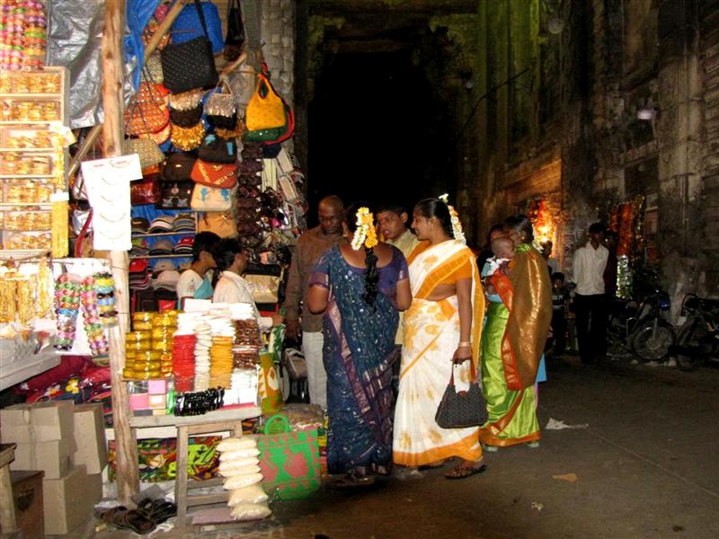 | Shops beneath the Gopuram entrance to temple in middle of temple road |