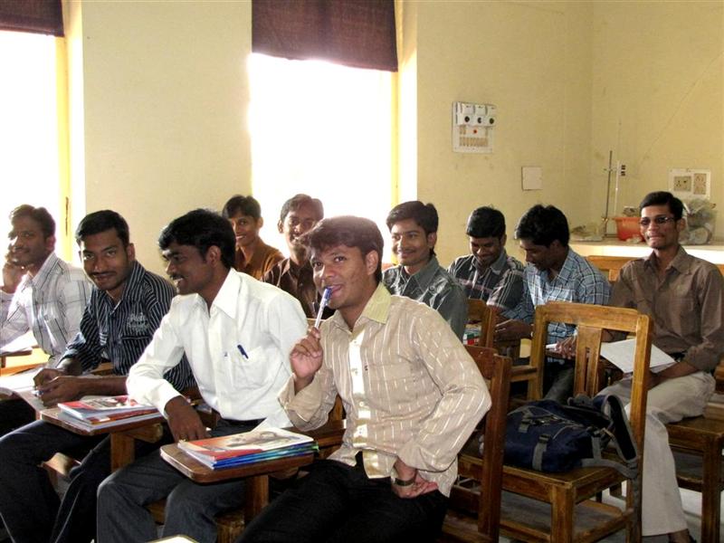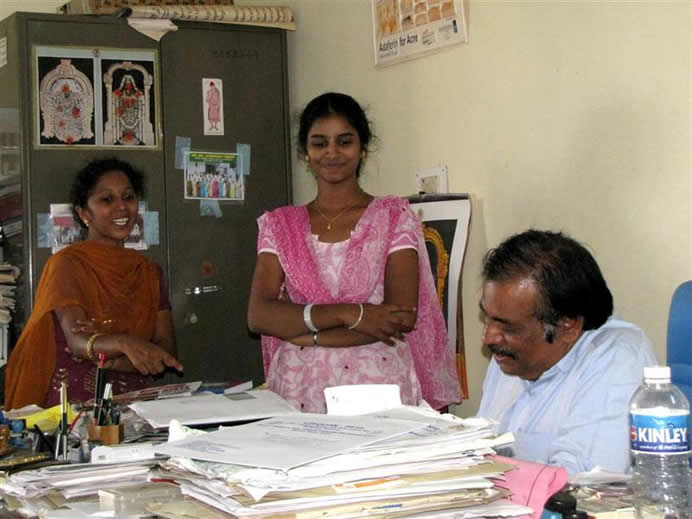 | Prof. Sai Gopal, my kind host at his overloaded desk, with two special Previous Year students [the slightly surreal title given to First year students] |