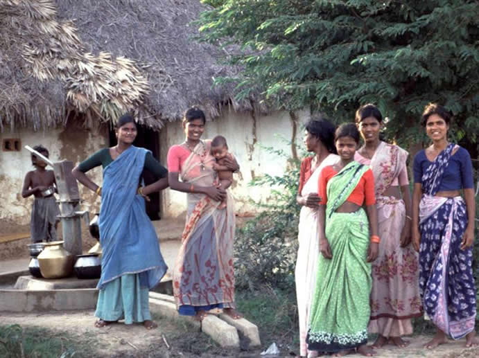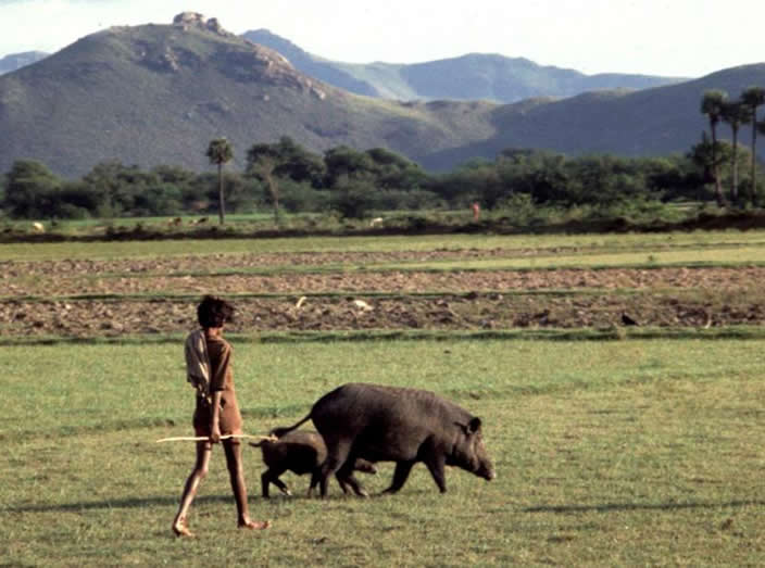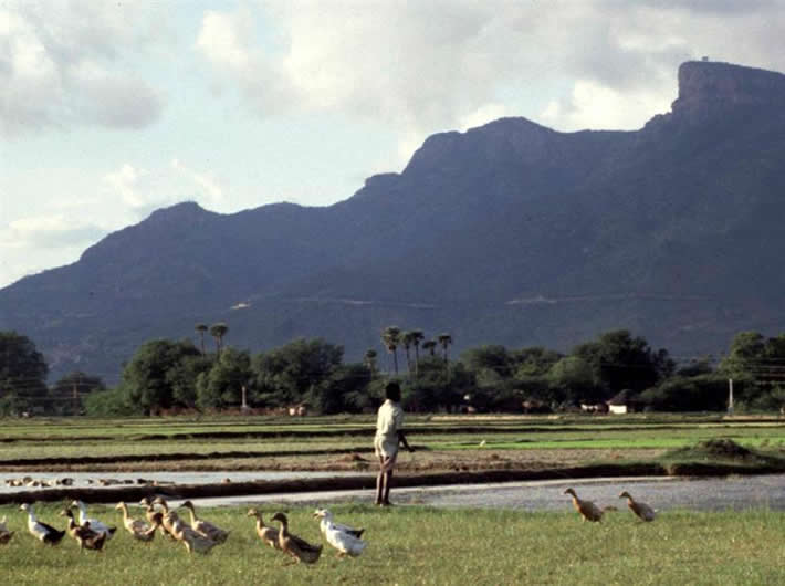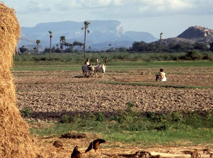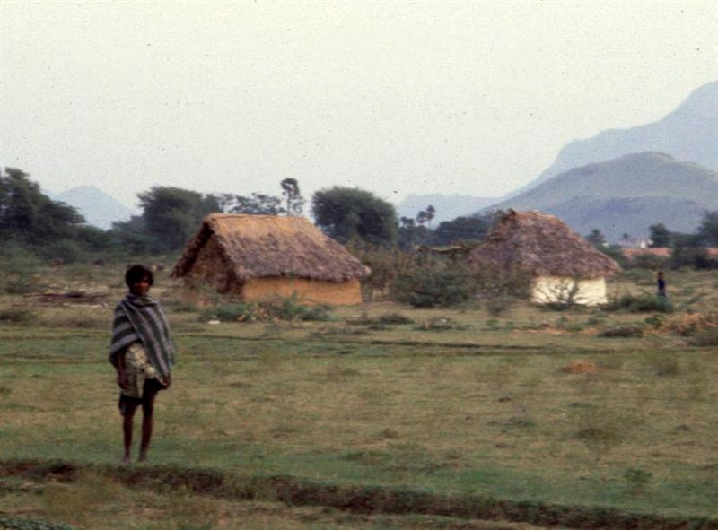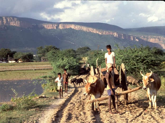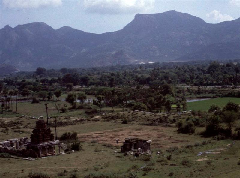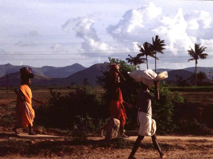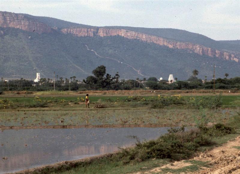 | The road going South from the village. The 'footpath' up the 15km to Tirumula can be seen. |