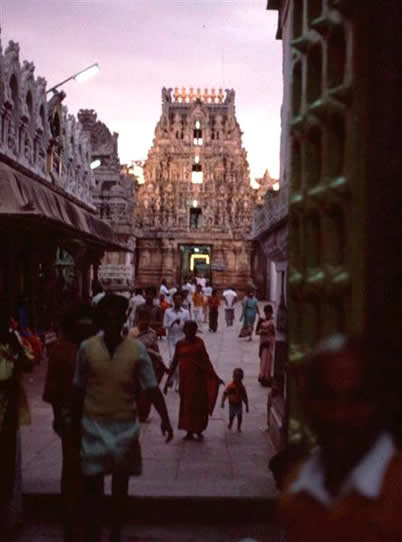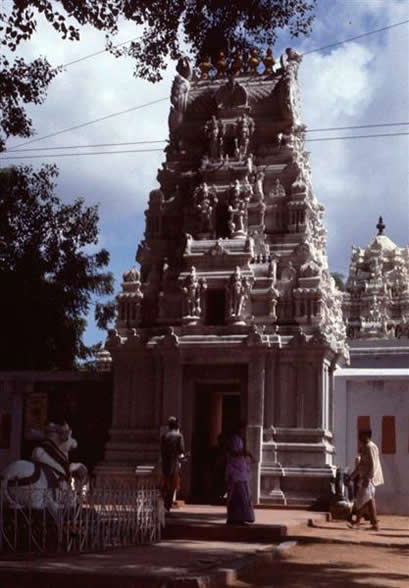| The sanctuary of the temple is behind the white pillars | The gopuram near the entrance of the temple |