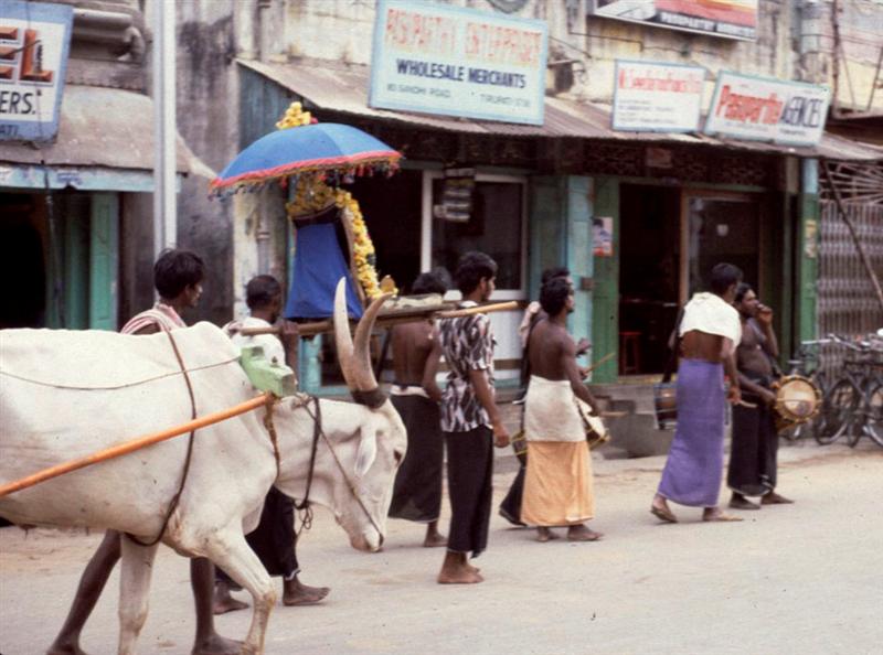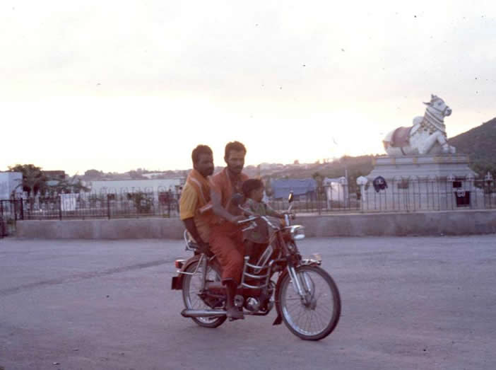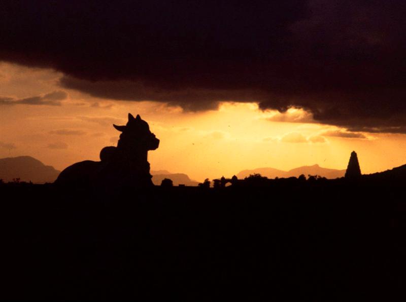 | Arriving at the temple at sunset with Nandi guarding the roundabout | |