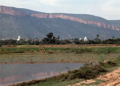 | View of the village and the seven hills from South. The road to the Tirumula temple can be seen |