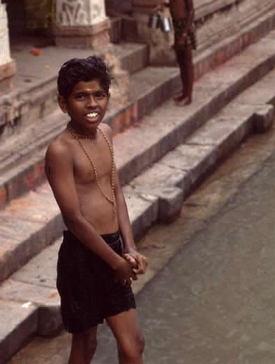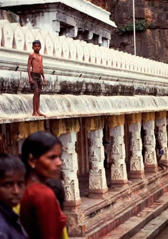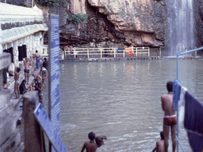 | Kapilatheertham (waterfall) temple. The waterfall cascades into the tank which is used for ritual bathing before darshan in the sanctuary, and also as the local swimming pool by the boys. Top of Page | |