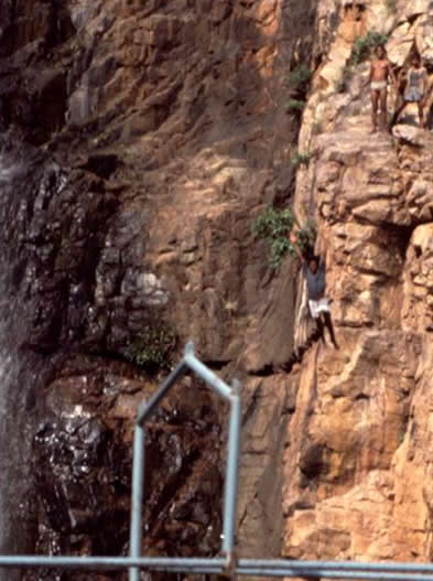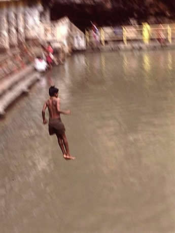 | The temple tank. The boys jump off the roof on the left or from high up on rock by the waterfall. | |