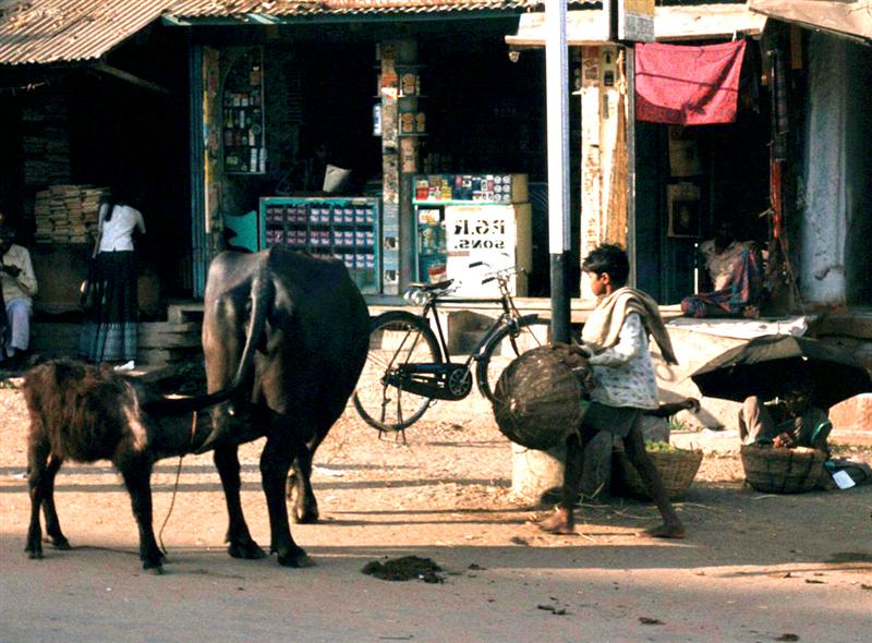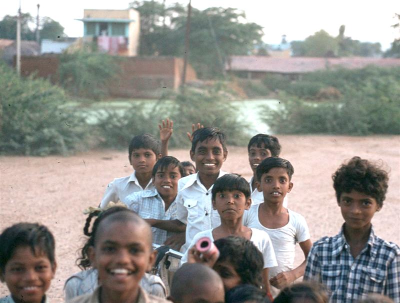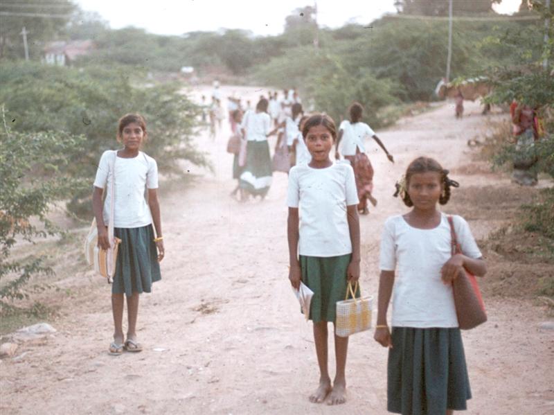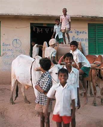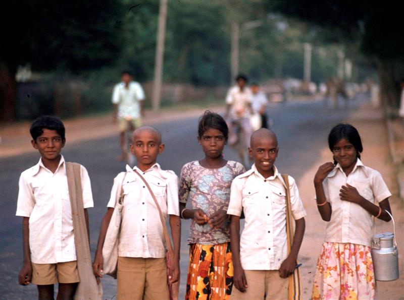 | School children on way home. The shaven boys gave their hair to Sri Venkateshwara at Tirumula temple. | |