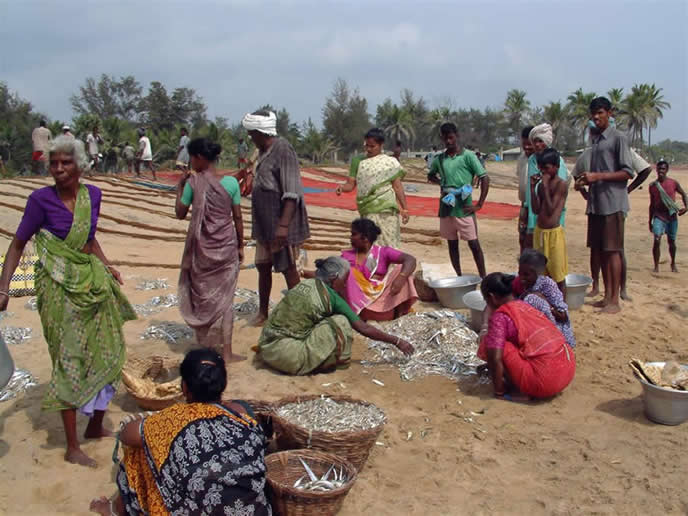 | They still use the small 6-plank boats | Sorting the fish with help from the crows |