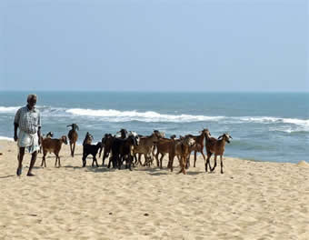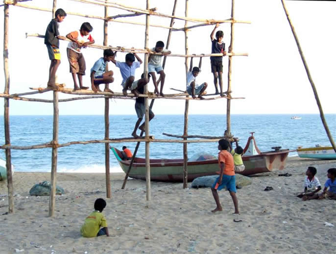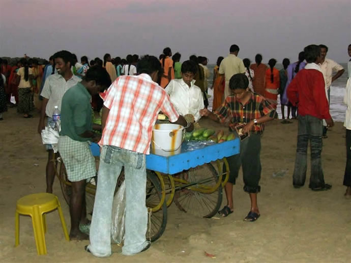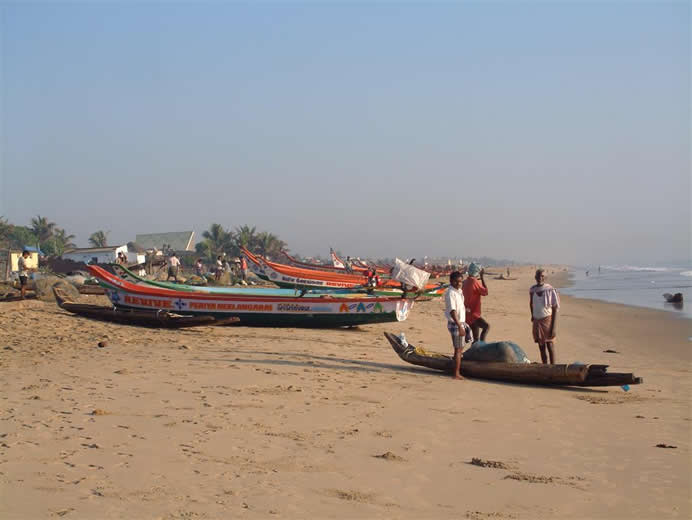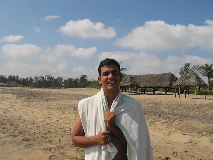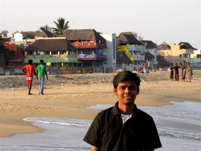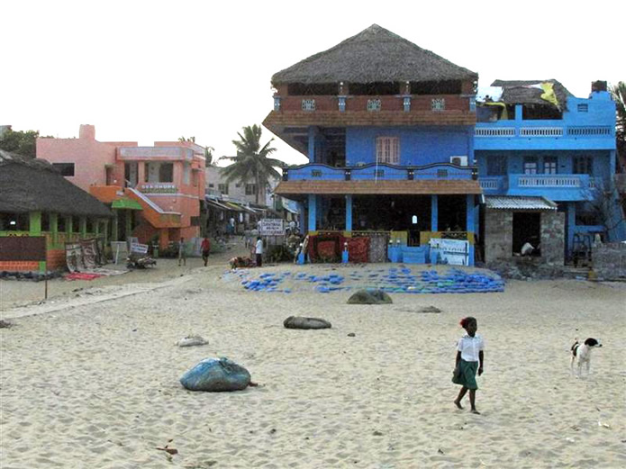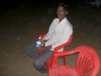 | 2005 I came here with Imran, an engineering student I had met a few years previously to stay, as usual, in the Golden Sun Beach Resort. We arrived only 4 weeks after the 2004 Boxing day Tsunami (Dec. 26th). I was greeted by the manager with a Welcome again sir, we have recently washed your room and provided new furniture. The water went up to 20 cm from the ceiling. No one was lost in the Tsunami but many parts of the resort were damaged. Most evidence was cleared away and some rebuilding done. The pool was cloudy and salty. There were very few fishing boats and most of the beach buildings were damaged. They achieved a lot in the last month and even more during the month i was in Tirupati. Go to my pictures of 2006 to see the successful restoration work | ||||