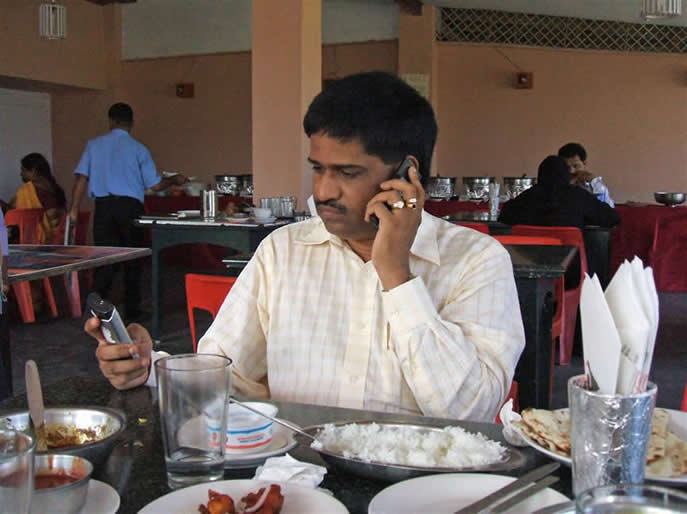 | With my friend John Prabakhar who had arranged for us to be met and taken to the VIP lounge at Chennai | John in his usual organising mode in the Golden Sun dining room | |||