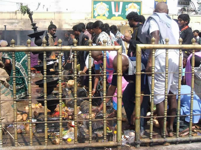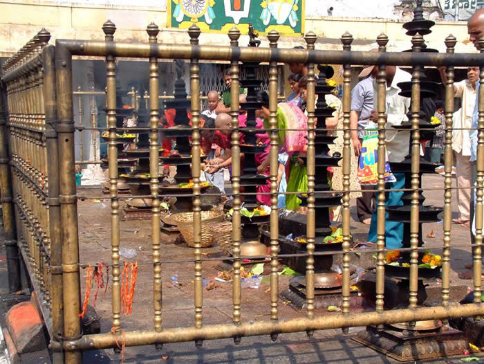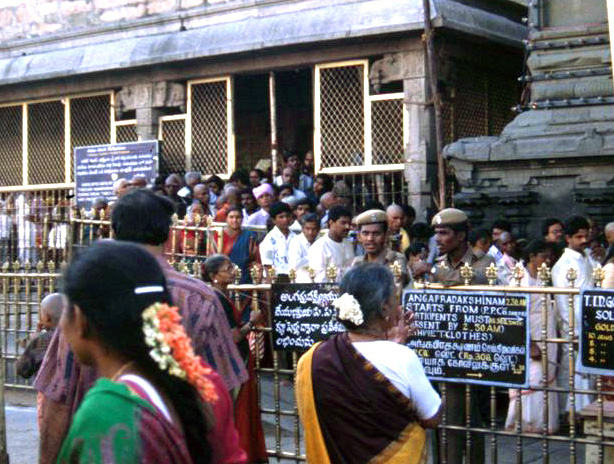 | Part of the packed queues for darshan of the god | The queue in a gilded cage | |