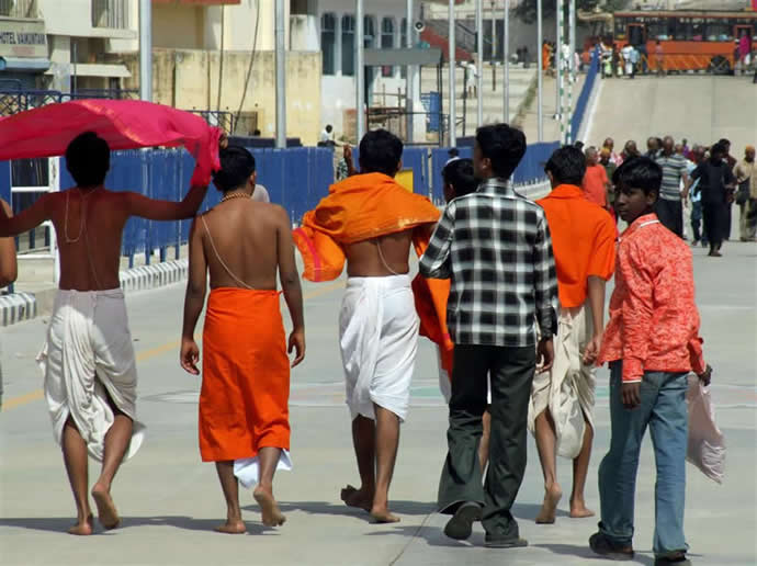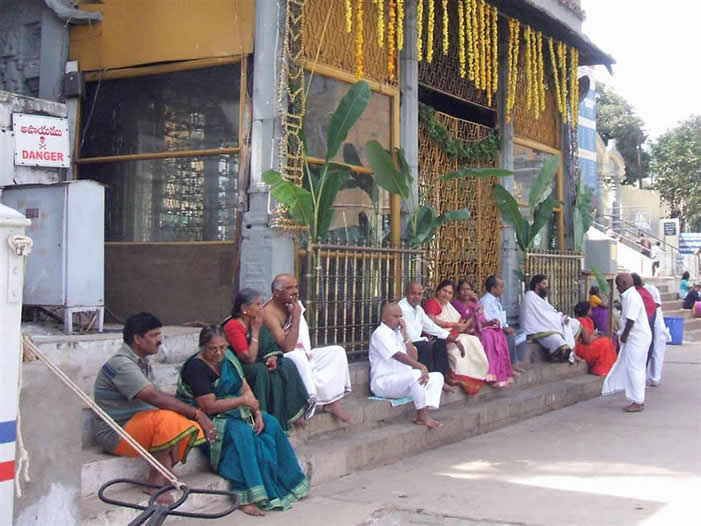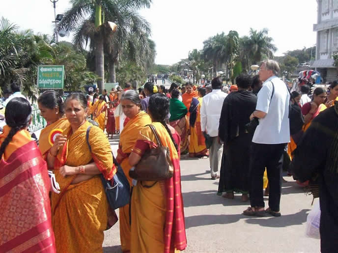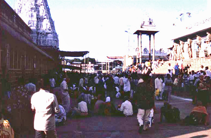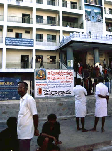 | A typical crowd. Those with shaven heads have offered thir hair to Sri Venkateswara | The gopuram at the entrance | |
