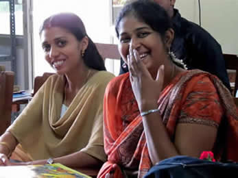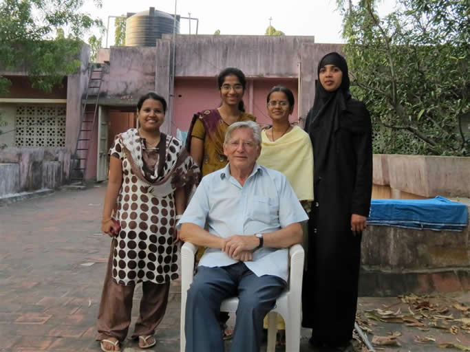 | Lalitha (left) and Bhanu (right) with other good friends. On the roof of guest house | "No Sir, you must be seated; you are central in our lives" | |||