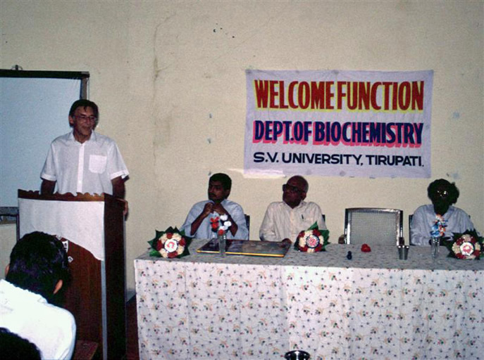 | ..................... | I first went to SVU 1982 to the Botany Department to teach a microbial physiology course. This was organised by Prof. N.V. Naidu, funded by the British Council. He then founded the Virology department. I returned for many visits , mainly to the virology, microbiology and biochemistry departments. In later visits I taught most of molecular biology and bioenergetics. I always stayed in the SVU guest house. Over the years I was funded by The British Council, The Royal Society, The Wellcome Trust, The Society for General Microbiology and The Biochemical Society. A couple of times I was self-funded using money given me for visits to Japan (from Mitsubishi and from The Japanese Society for the Promotion of Science). Ths staff of the University were always very hospitable and were wonderful hosts. The courses are all at MSc level and last 2 years; The final year and the Previous year (!). I have included pictures of staff and student in my first visits (1982-2001) |