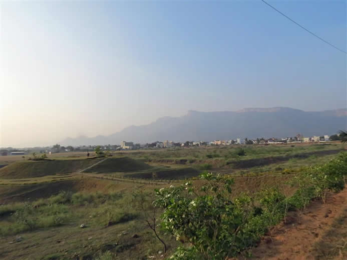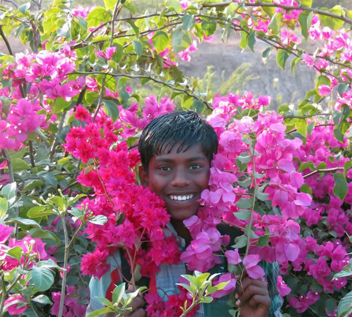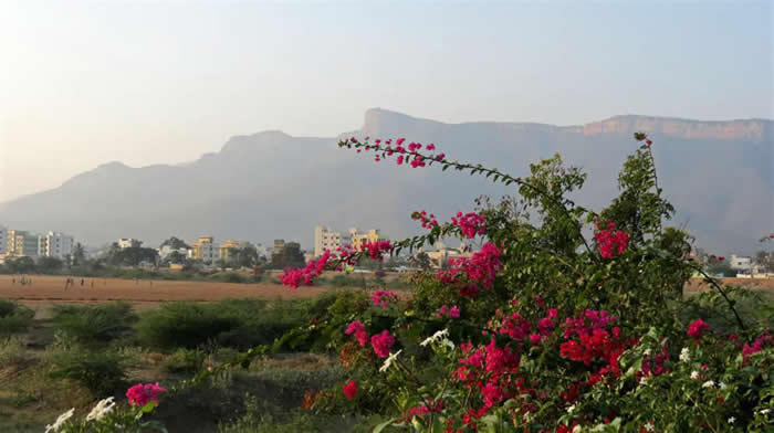 The bougainvillea flowers mark the surrounding path. The flats are those encroching on Mallipalli |