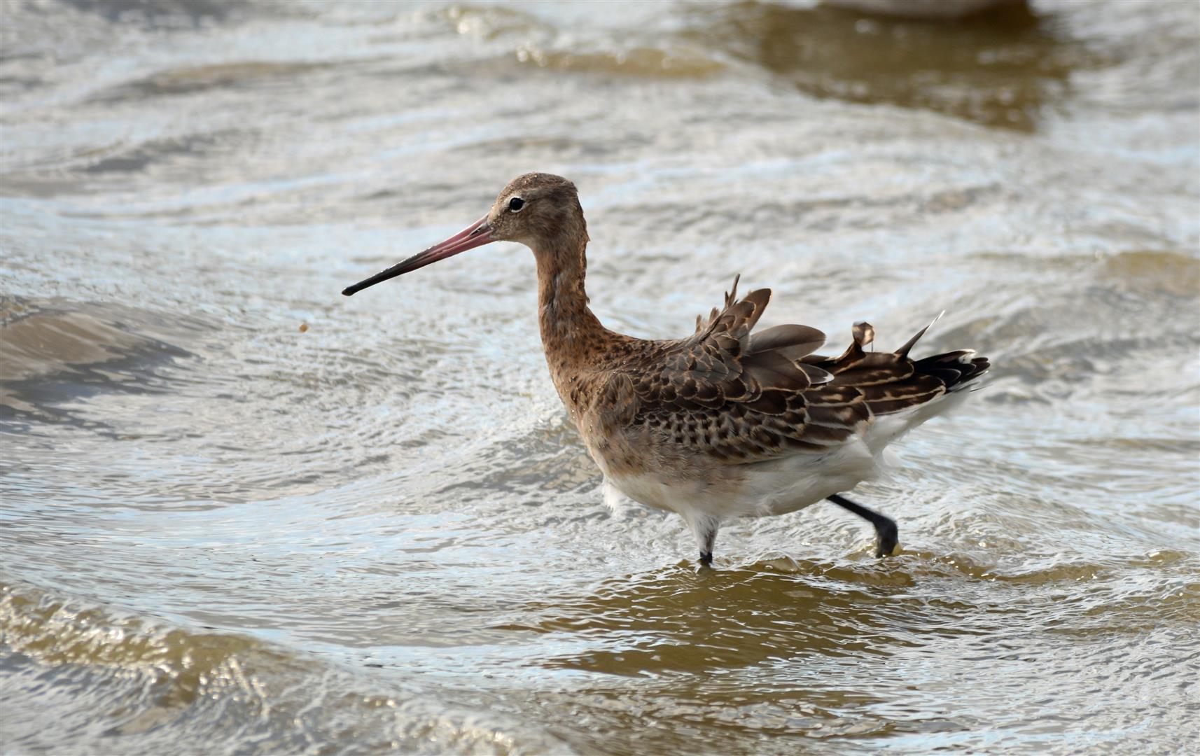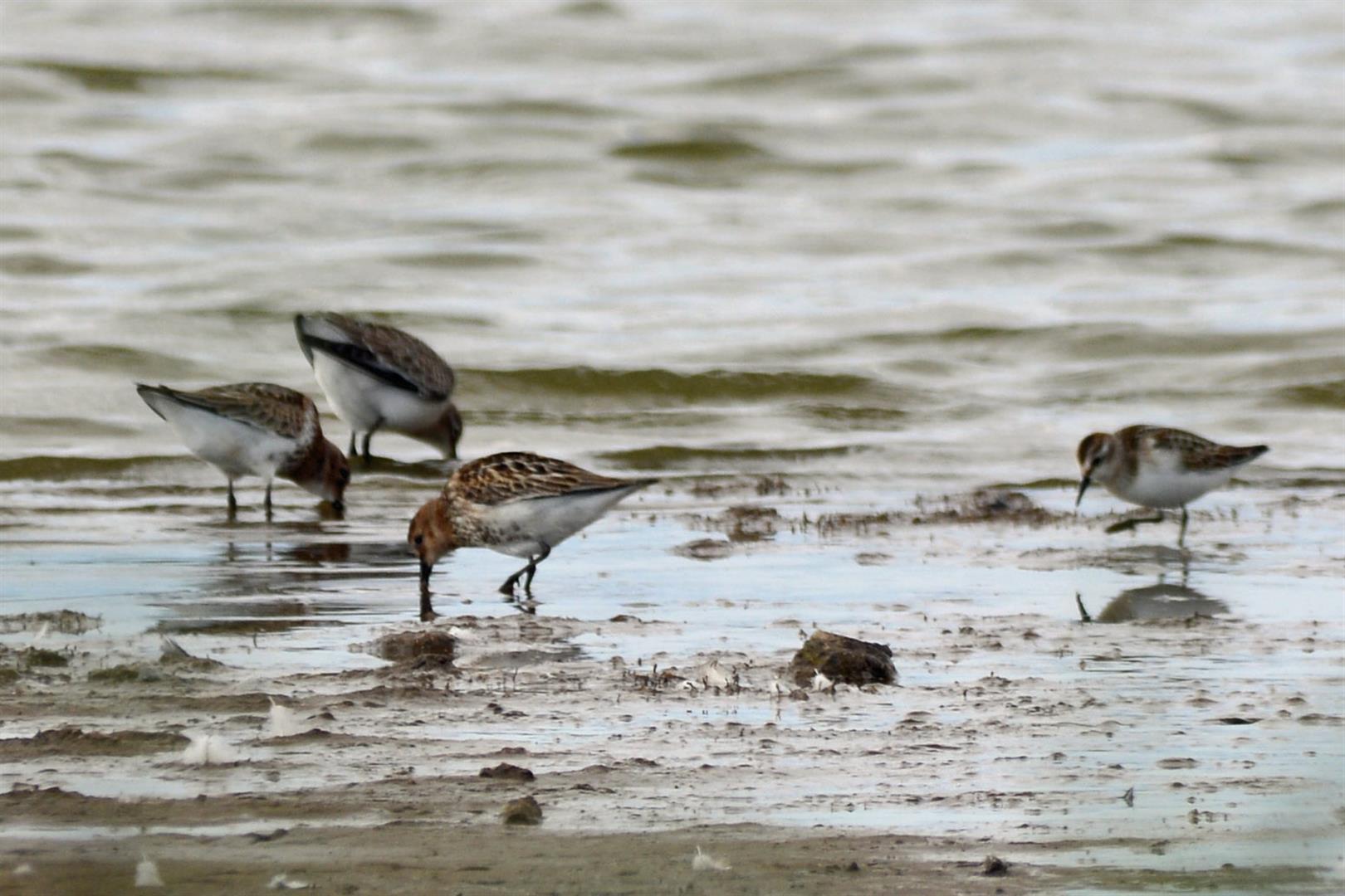 | TOP | Wind-ruffled Black-tailed Godwit | Dunlin and, on the right, a tiny Little Stint. A kind old lady told us where it was or i would have missed it. |