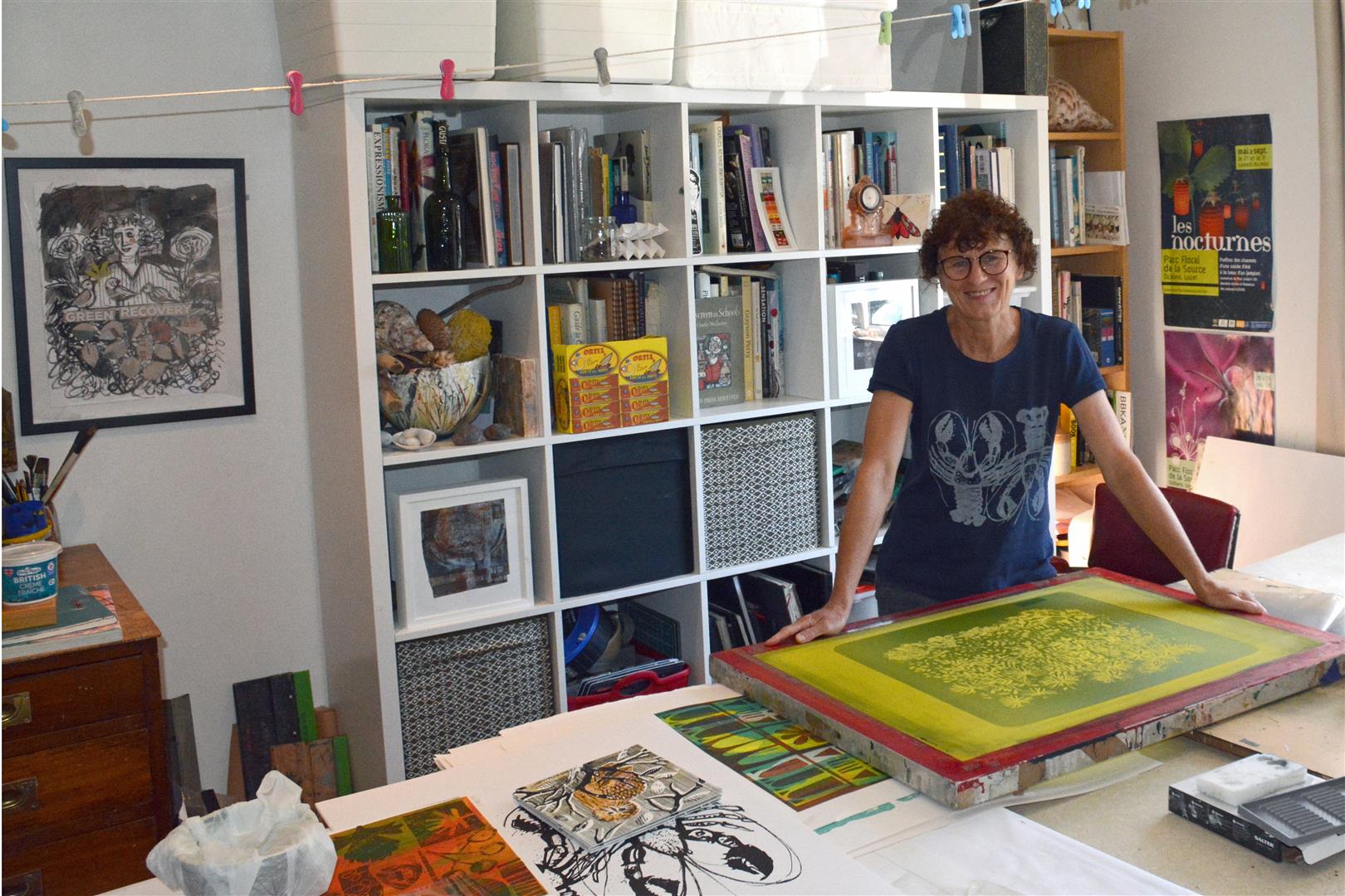 | TOP | Angela demonstrating her silk-screen printing of her beautiful pictures. See her work on her website: | |