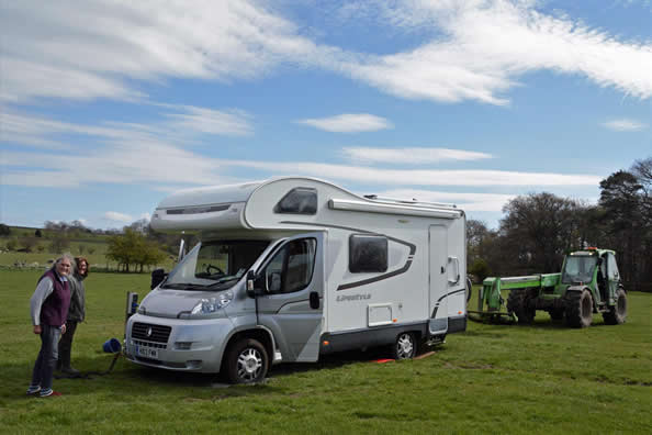 | I parked with a wheel in a muddy hole so we needed the skill of Wendy with her tractor to heave us out. Embarrassing but fun. | |
