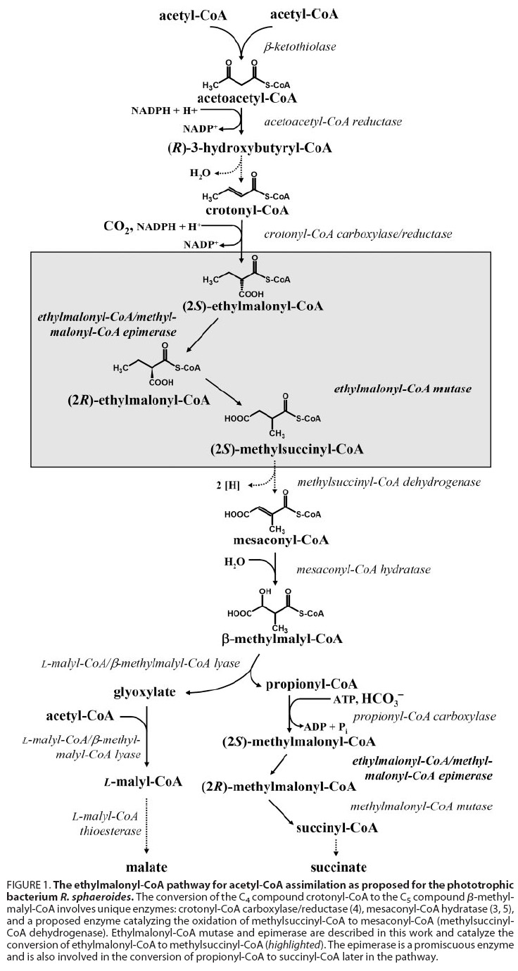 | The EthylmalonylCoA pathway for growth of R. sphaeroides on C2 compounds [Refs 14, 15] |