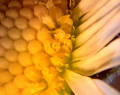 Photography through the microscope: The top picture is the centre of a daisy taken with the Wild microscope at 6x magnification. Lower right is (unknown) species of alga showing cilia. |