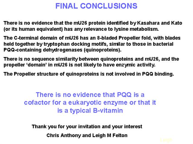 When I pointed out to the journal Nature that their high reputation was being used to justify investments of millions of dollars in the development of PQQ as a vitamin, they investigated the original paper, agreed with our objections and published our argument against it (Felton & Anthony, Nature Vol. 433, 2005). They also published (alongside ours) a paper by Rucker disagreeing with the conclusions of Kasahara and Kato on nutritional grounds, concluding “that insufficient information is available so far to state that PQQ uniquely performs an essential vitamin function in animals”.